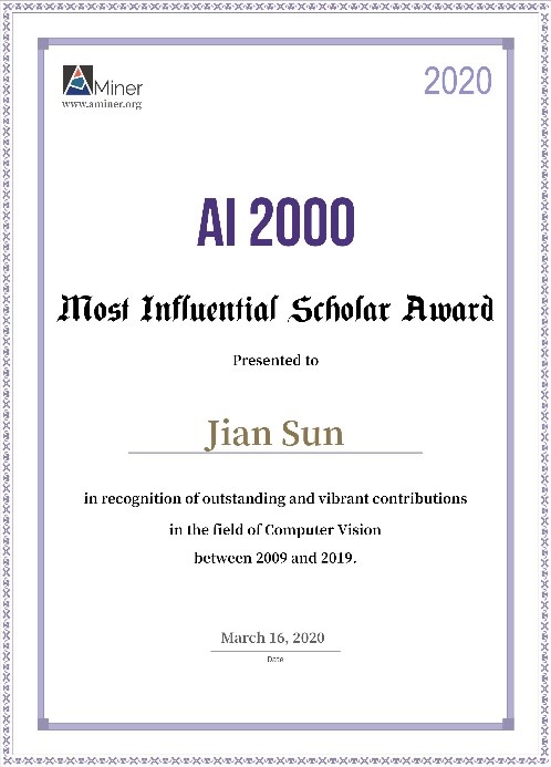 院长、兼职教授。孙剑博士自2002年以来在CVPR、ICCV、PAMI等顶级学术会议和期刊上发表学术论文100余篇,两次获得CVPR最佳论文奖(2009、2016),Google Scholar总引用80000余次(截止2019年6月),于2010年被美国权威技术期刊MIT Technology Review评选为“全球35岁以下杰出青年创新者TR35”。