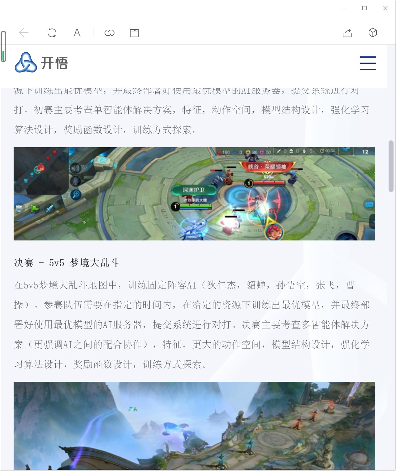 决赛任务为在5v5 梦境大乱斗地图中,训练固定阵容AI(狄仁杰,貂蝉,孙悟空,张飞,曹操)。参赛队伍需要在指定的时间内,在给定的资源下训练出最优模型,并最终部署好使用最优模型的AI服务器,提交系统进行对战。决赛主要考查多智能体解决方案(更强调AI之间的配合协作),特征,更大的动作空间,模型结构设计,强化学习算法设计以及奖励函数设计。