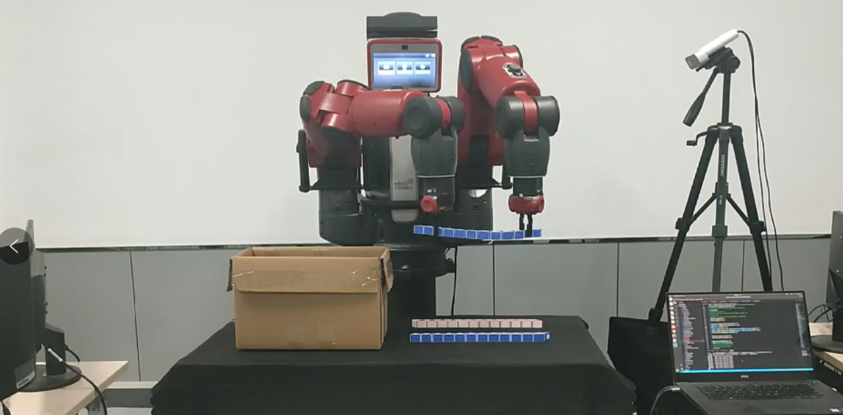 比赛分为任务赛和挑战赛两个部分。任务赛中,各赛队展示自己对于三个任务(堆叠抓取,异形抓取和力控协同放置)的算法设计和实现细节;挑战赛中,各赛队线上调试机器人,并直播展示任务完成效果,由裁判根据任务规则对各赛队表现评分。任务赛的三个任务着重点各有不同:堆叠抓取考验机器人控制精度和检测算法的准确度;异形抓取考查对于异形物体抓取部位的设计以及双臂协作策略的设计,具体任务是将位于机器人左边工作台上正面朝下堆叠摆放的玩偶正面朝上堆叠放置到机器人工作台右边的盒子中;任务三考验力控协同方案设计,机器人需要双臂协同将魔尺掰弯并且放入比魔尺长度小的箱子中。RoboFLY代表队综合运用视觉检测算法和运动控制算法,对双臂协作策略进行了精心设计,出色地完成了三个任务,综合得分977.5(满分1000)。