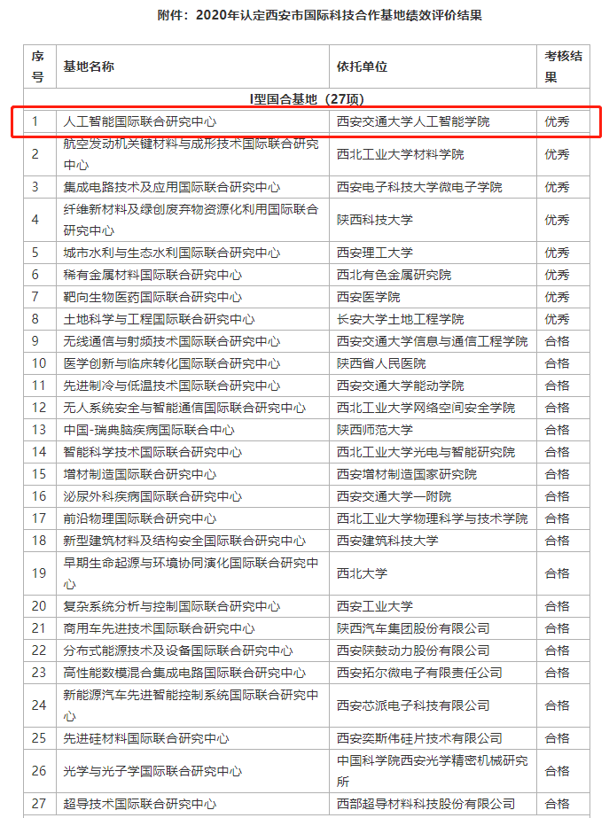 西安市科学技术局7月12日公布了2020年西安市国际科技合作基地绩效评价结果,根据《西安市科技计划项目管理办法》(市科发〔2020〕19 号)的有关规定,“人工智能国际联合研究中心”在 2020年西安市国际科技合作基地绩效评价结果中考核优秀。本次共27个I型国合基地和22个S型国合基地参与考核,其中8个I型国合基地考核“优秀”,4个S型国合基地考核“优秀”。