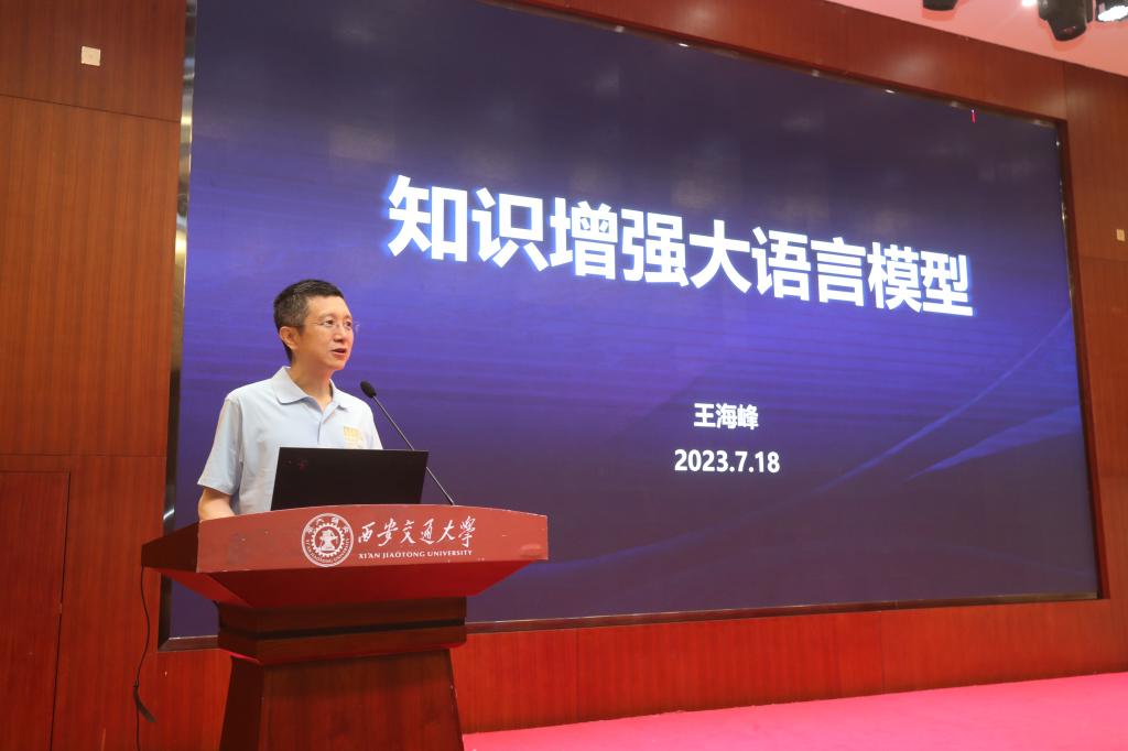 在研讨会主旨报告环节,IEEE/ACL Fellow、百度首席技术官、深度学习技术与应用国家工程研究中心主任王海峰博士做了《知识增强大语言模型》精彩报告。他介绍了人工智能的发展历程、未来发展方向及其在不同领域的应用,强调了大语言模型的关键要素及其应用场景。通过百度“文心一言”大语言模型的技术升级和改进,王海峰博士分析了大模型产业化面临的难点和挑战,并结合西安市的文旅产业特色,向与会师生生动形象地展示了“文心大模型3.5”在旅游策划、智能办公等领域的应用。