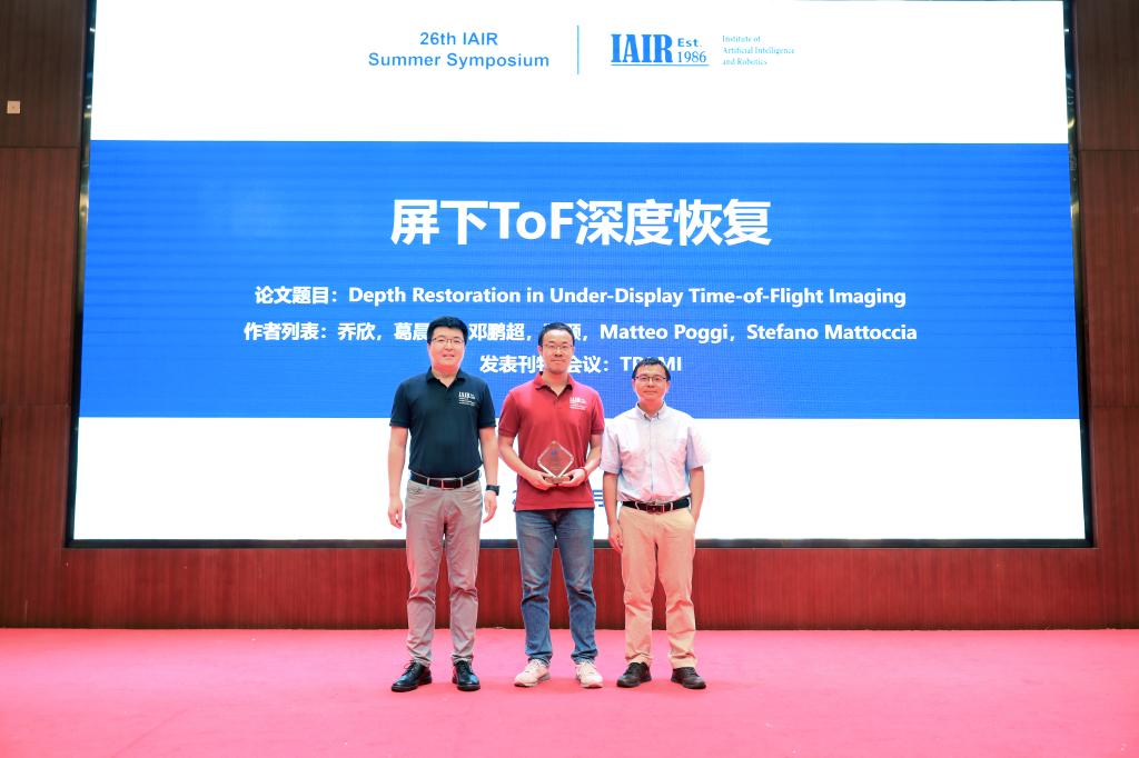 在口头报告环节,人机所32位博士、硕士研究生分别在主、分论坛分享了他们近一年内在顶级学术会议、知名学术期刊上发表的论文,同时以海报的形式进行展示。其中,乔欣博士分享了其作为第一作者发表在人工智能顶级期刊IEEE T-PAMI上的论文“屏下ToF深度图像恢复”。郑南宁教授指出,葛晨阳老师团队对基于深度学习的TOLED屏下ToF深度恢复算法的研究是近年人机所最具学术和产业价值的成果之一,他勉励广大师生树立学术自信,通过不断学习、探究和实践来总结经验、守正创新。
