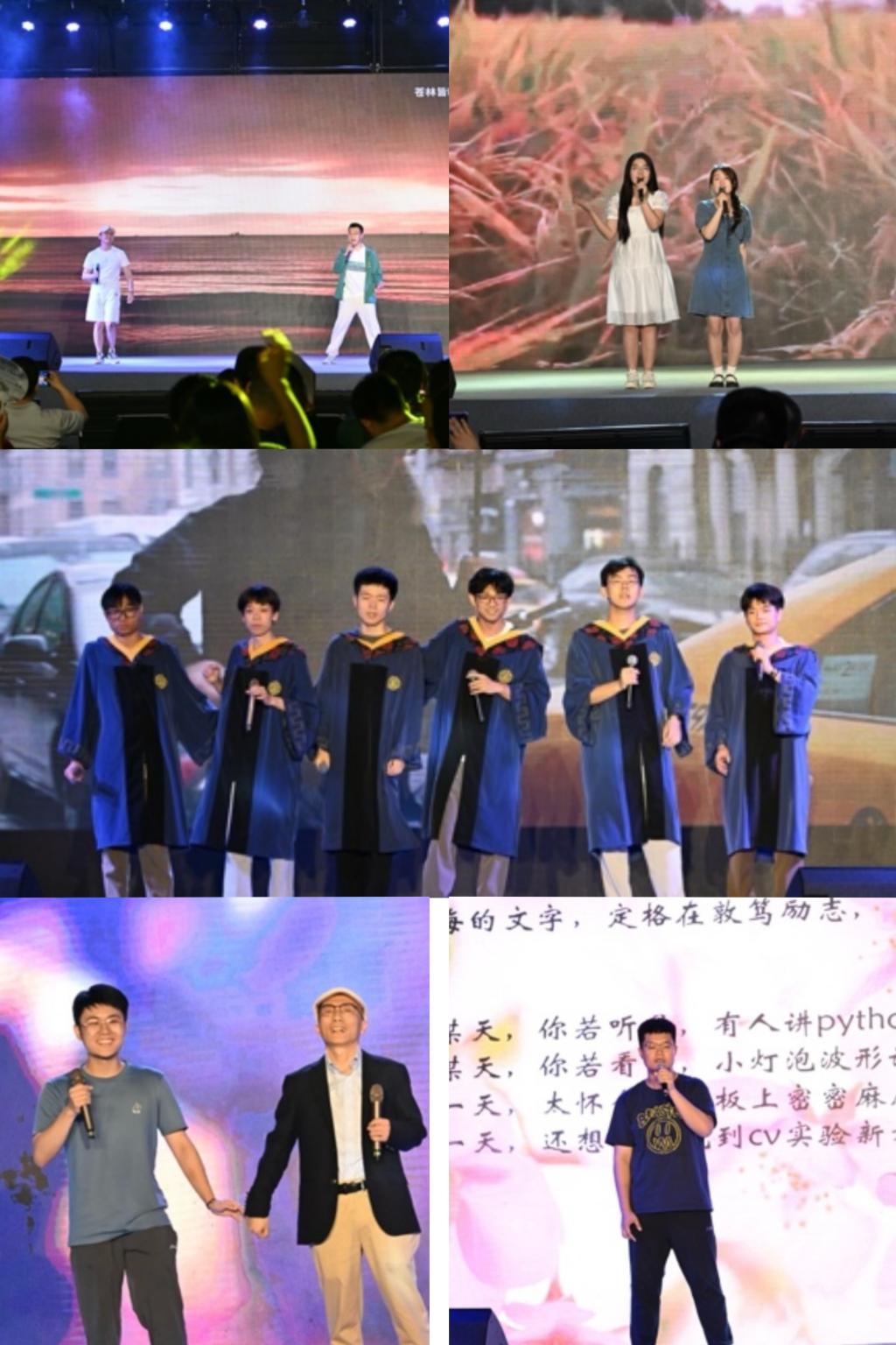徐霁琛和阳旭同学的《外婆的澎湖湾》为毕业晚会带来了一抹活泼的色彩;贾亦文和陈依依同学的《入海》如同一幕精心编排的舞台剧;陈霸东老师与郑凯中同学的《父子》被赋予了情景剧般的深度和感染力。《咸宁西路的日子》唤起了毕业生们对校园生活的美好回忆;王弋飞同学的《凤凰花开的路口》悠扬而深远;丁宁老师的《好想大声说爱你》激起了毕业生们的深情怀念;《如约而至》传递着对未来的坚定信念;女老师们演绎的《祝你一路顺风》,传递着对学生们未来旅程的美好祝愿。