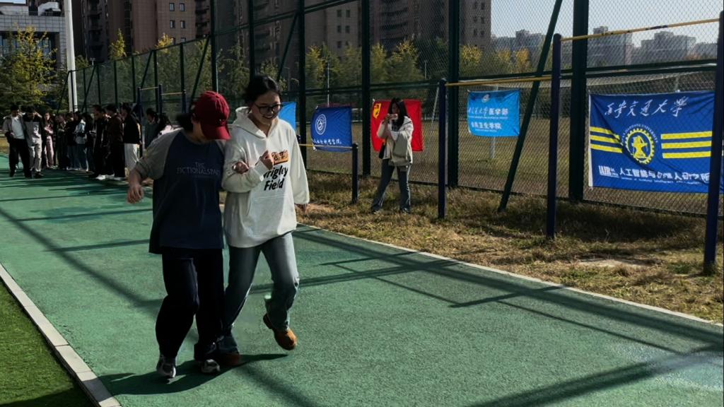 在趣味运动会的“背部运球接力”项目中,两人一组需用背部夹住气球,各队伍展示了五花八门的技巧,力求在不让气球掉落的同时,以最快速度完成接力任务。