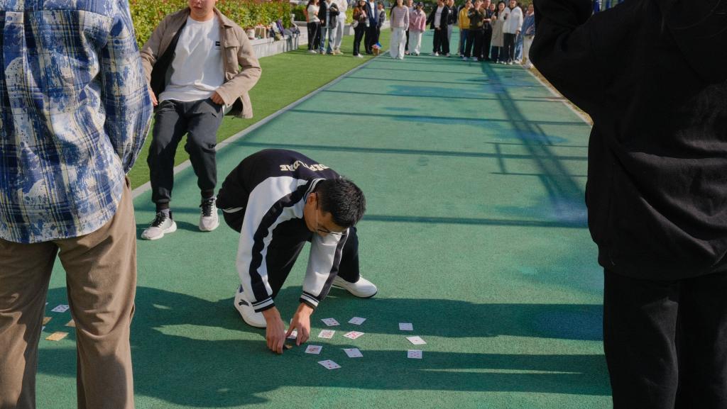 在趣味运动会的“趣味翻扑克”项目中,队员们通过接力的方式依次翻开扑克牌,目标是按数字顺序从小到大将13张扑克牌全部翻至正面朝上。队员们可以自由发挥创意,制定策略,并在接力过程中传递信息,以尽可能快的速度完成挑战。这个项目考验了团队的沟通能力、策略规划和执行力,同时也激发了队员们的创造力和团队协作精神。