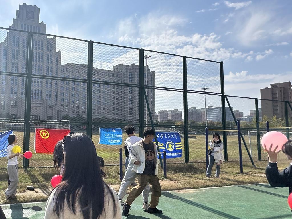 在趣味运动会的“踩气球”项目中,各小组参与了一场五分钟的踩气球比赛,通过踩破气球来象征性地释放学习生活中的压力,最终根据剩余气球的数量来决定排名。