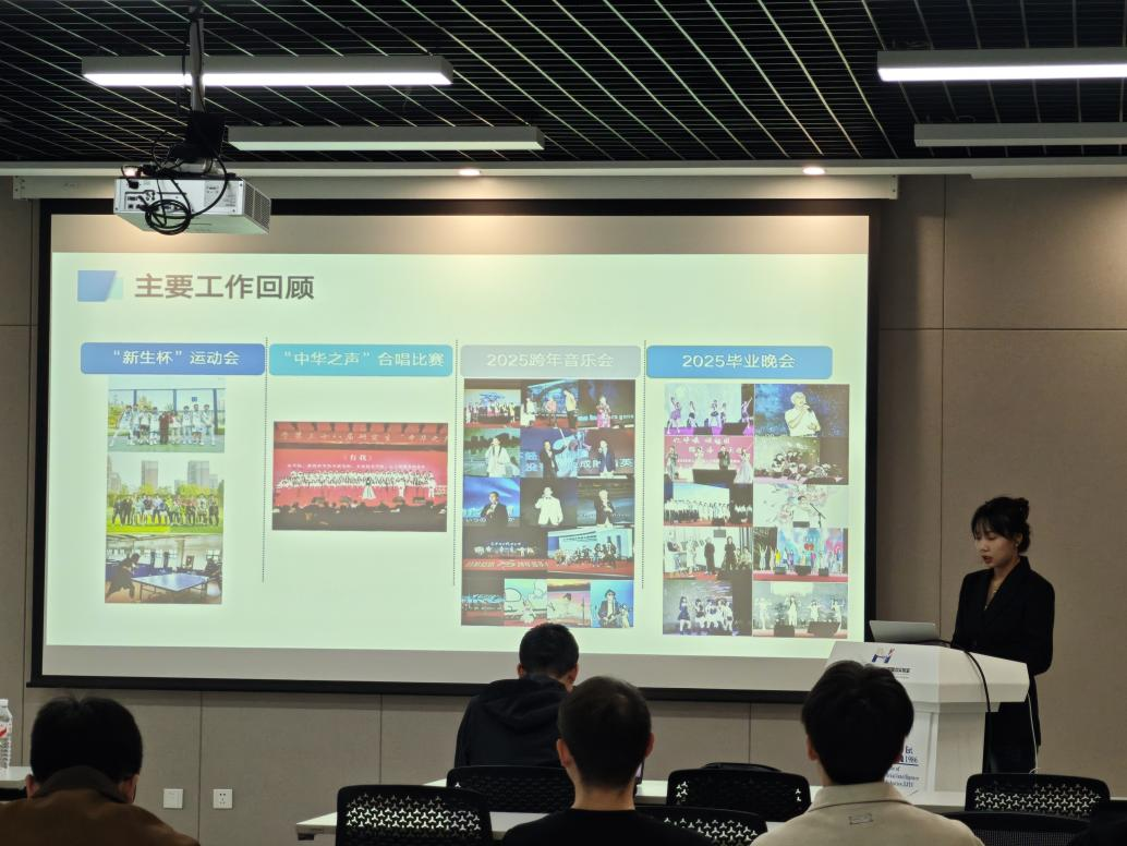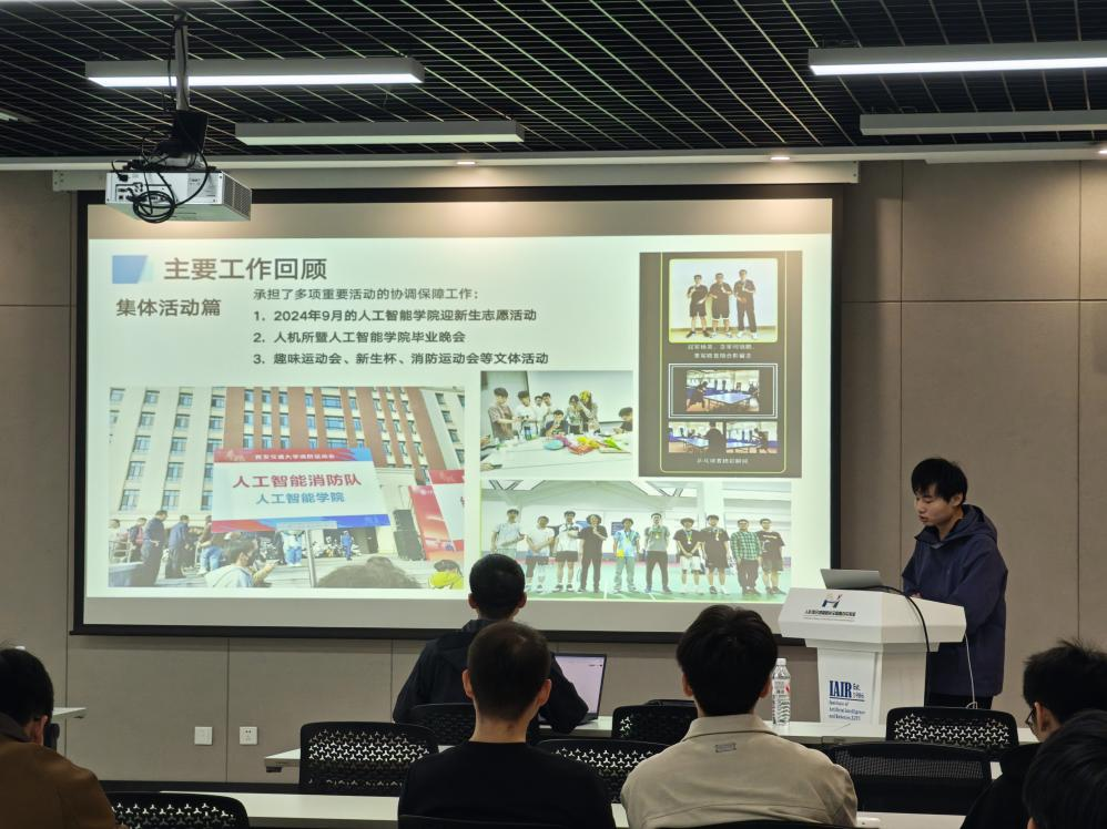 学院常务中心主席团成员陆宇恒简单介绍了常务部门结构和职能,认为常务部门是研究生会的“中枢神经”与“坚实后盾”,同时回顾了前一年的主要工作,并进行了问题反思,认为内部沟通效率有待提升,工作简报形式可更生动。