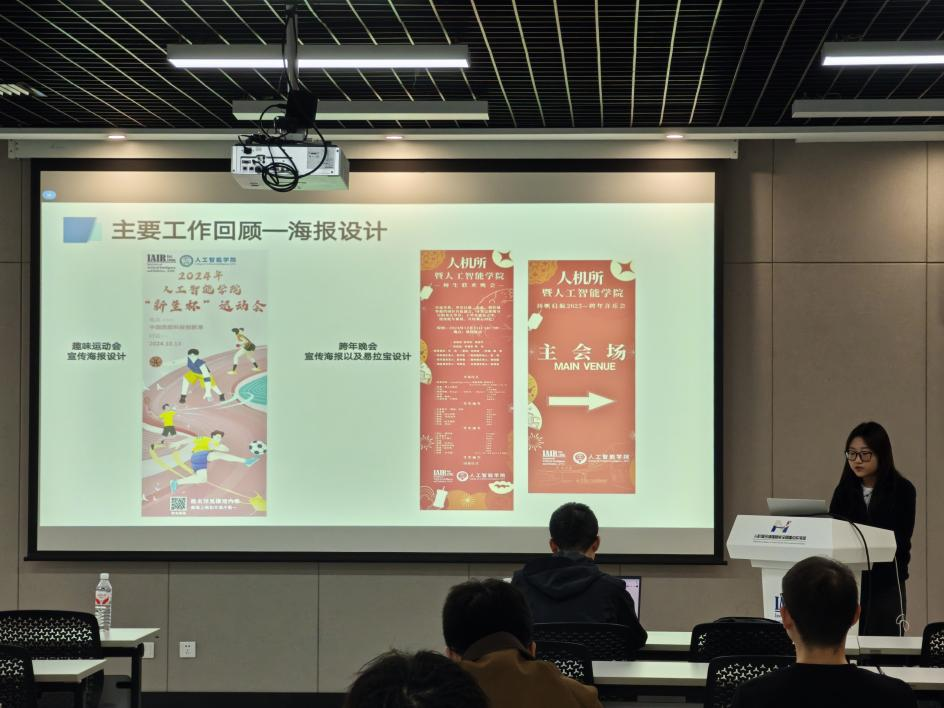 学院宣传中心主席团成员李佳怡简单介绍了宣传部门结构和职能,宣传部门主要工作包括通知撰写,推送排版,海报设计以及摄影工作等等,同时李佳怡指出工作流程与协同方面,内容质量与创新方面仍然需要改进,最后也期望在未来的一年里,宣传部门能够建立更健全的制度,并完善资源库建设。
