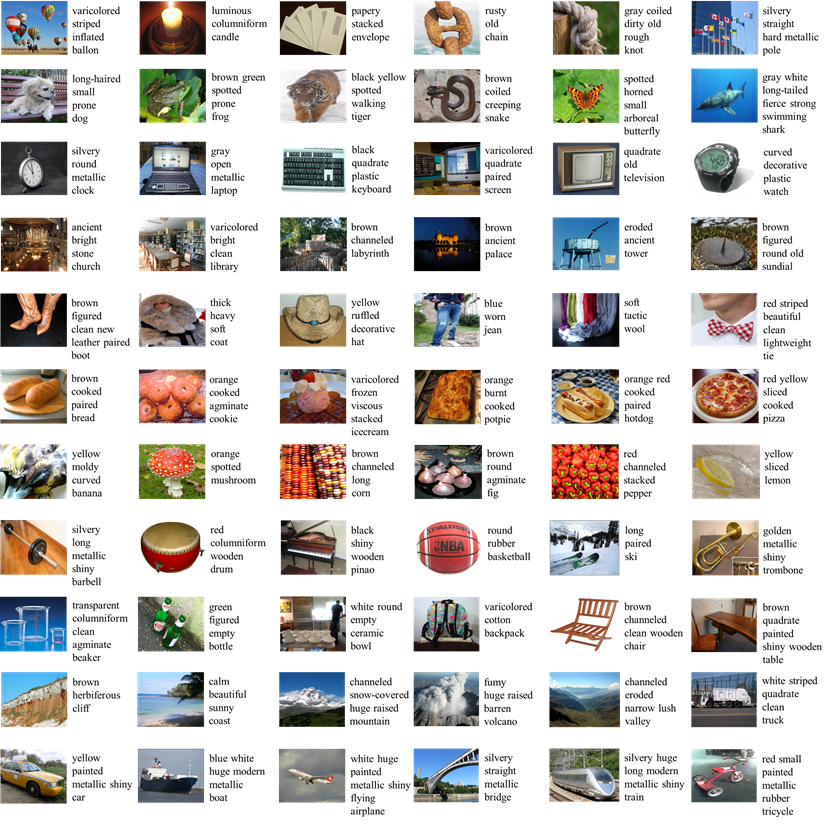 因此,我们建立了一个多属性数据集(Multi-Attribute Dataset, MAD),用于真实地反映物体的多属性性质,从而适用于测试组合零样本识别模型在多属性设置下的性能。MAD数据集是基于ImageNet数据集创建的,包含158个属性、309个物体和8030个属性-物体组合,共计116,099张图像。此外,我们还提出了新的用于评价模型在多属性设置下的性能度量指标——Hard和Soft,详情请参见已发表论文。